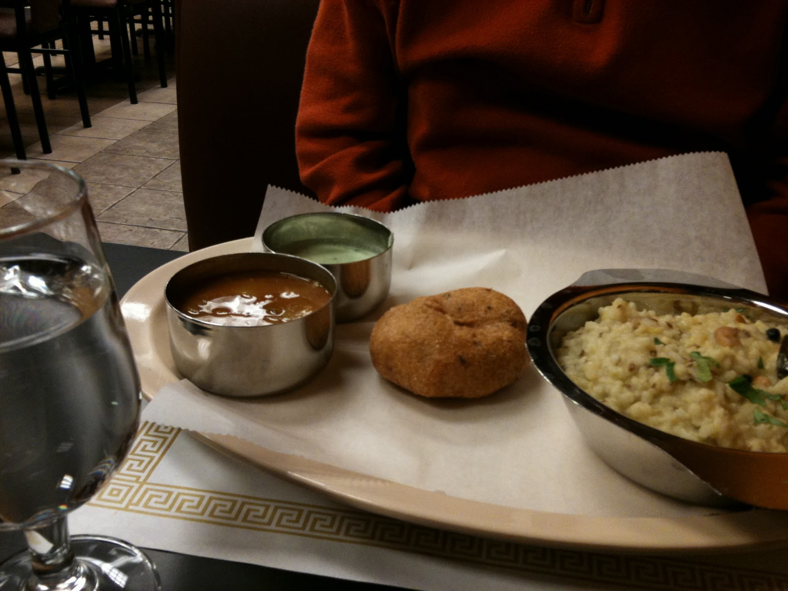 Pongal is a traditional South Indian preparation of rice, dal, whole black peppers, cashews, lots of heavenly ghee. It is comfort food at its finest and healthiest. And it is panacea for my Pitta-aggravated soul and body. P offered me a taste and then the entire plate itself. The sides were sambar and coconut chutney. I pretty much cleaned up the coconut chutney but the sambar, as delicious as it looked, I had to avoid. Tomatoes + red chillies + tamarind is a lethal combination for me, at the moment. The Vada was delicious too! Not greasy at all, it was very nicely spiced and had the perfect “crunch” in your mouth.
