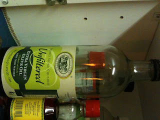 Pesto also contains cheese (mostly Parmesan or Romano, as this recipe mentions). I had paneer at home, and so I used it instead. Pulse it all together. Don’t forget to add salt and pepper. Pour in some good olive oil while it’s getting pulsed. I bought this brand (below, right) from Dekalb Farmers Market. You can also see the smaller bottle of chili oil next to it, a bottle of Braggs right behind, and possibly the can of sesame oil to the right of the picture. Just giving you a mini-tour of the oils and seasoning cabinet… 🙂